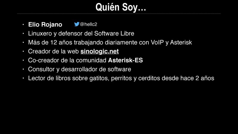 Quién Soy… @hellc2 Elio Rojano • Linuxero y defensor del Software Libre • Más de 12 años trabajando diariamente con VoIP y Asterisk • Creador de la web sinologic.net • Co-creador de la comunidad Asterisk-ES • Consultor y desarrollador de software • Lector de libros sobre gatitos, perritos y cerditos desde hace 2 años