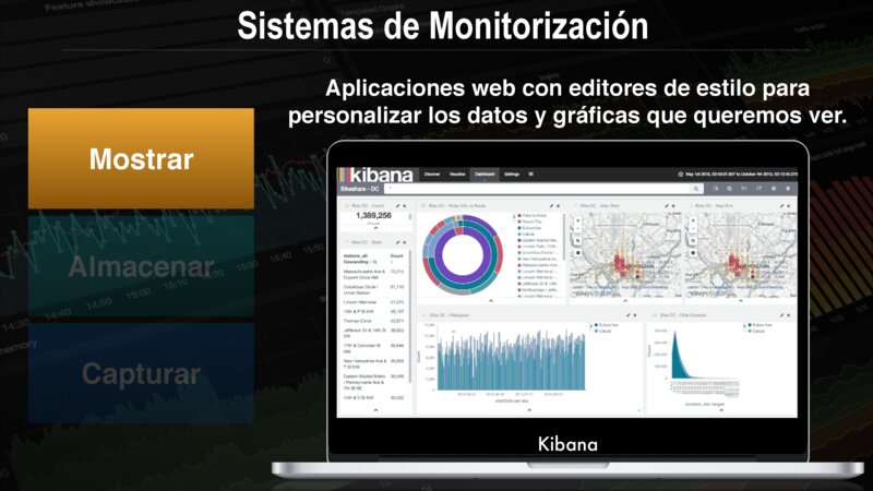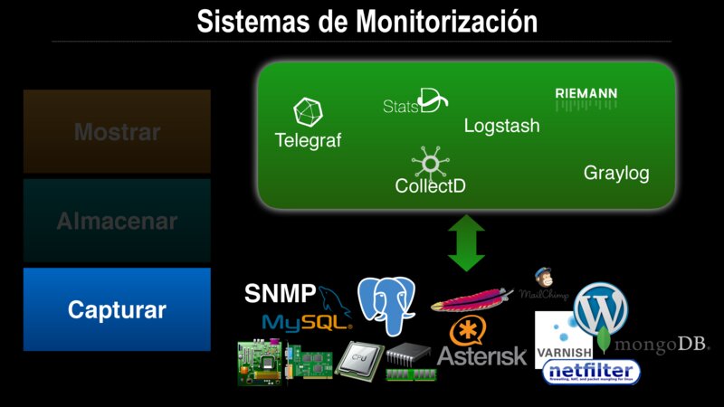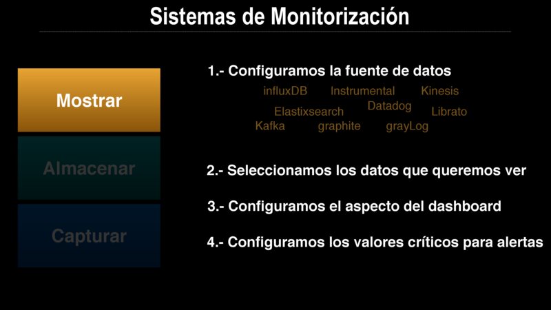 Sistemas de Monitorización 1.- Configuramos la fuente de datos Mostrar Almacenar influxDB Instrumental Kinesis Datadog Elastixsearch Librato Kafka graphite grayLog 2.- Seleccionamos los datos que queremos ver 3.- Configuramos el aspecto del dashboard Capturar 4.- Configuramos los valores críticos para alertas