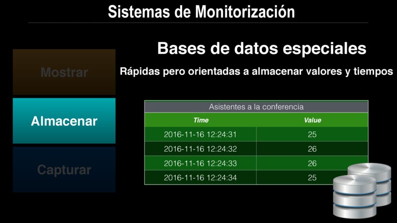 Sistemas de Monitorización Bases de datos especiales Mostrar Rápidas pero orientadas a almacenar valores y tiempos Asistentes a la conferencia Almacenar Capturar Time Value 2016-11-16 12:24:31 25 2016-11-16 12:24:32 26 2016-11-16 12:24:33 26 2016-11-16 12:24:34 25