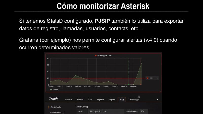 Cómo monitorizar Asterisk Si tenemos StatsD configurado, PJSIP también lo utiliza para exportar datos de registro, llamadas, usuarios, contacts, etc… Grafana (por ejemplo) nos permite configurar alertas (v.4.0) cuando ocurren determinados valores: