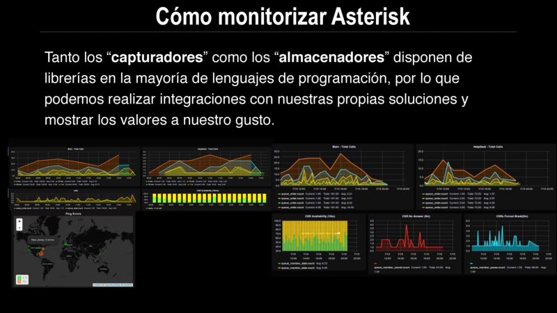 Cómo monitorizar Asterisk Tanto los “capturadores” como los “almacenadores” disponen de librerías en la mayoría de lenguajes de programación, por lo que podemos realizar integraciones con nuestras propias soluciones y mostrar los valores a nuestro gusto.
