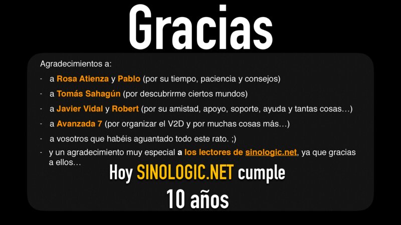 Agradecimientos a: Gracias a Rosa Atienza y Pablo (por su tiempo, paciencia y consejos) a Tomás Sahagún (por descubrirme ciertos mundos) a Javier Vidal y Robert (por su amistad, apoyo, soporte, ayuda y tantas cosas…) a Avanzada 7 (por organizar el V2D y por muchas cosas más…) a vosotros que habéis aguantado todo este rato. ;) y un agradecimiento muy especial a los lectores de sinologic.net, ya que gracias a ellos… Hoy SINOLOGIC.NET cumple 10 años