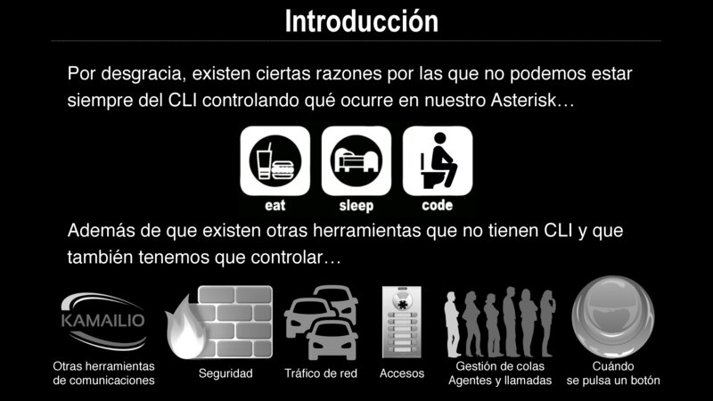 Introducción Por desgracia, existen ciertas razones por las que no podemos estar siempre del CLI controlando qué ocurre en nuestro Asterisk… Además de que existen otras herramientas que no tienen CLI y que también tenemos que controlar… Otras herramientas de comunicaciones Seguridad Tráfico de red Accesos Gestión de colas Agentes y llamadas Cuándo se pulsa un botón