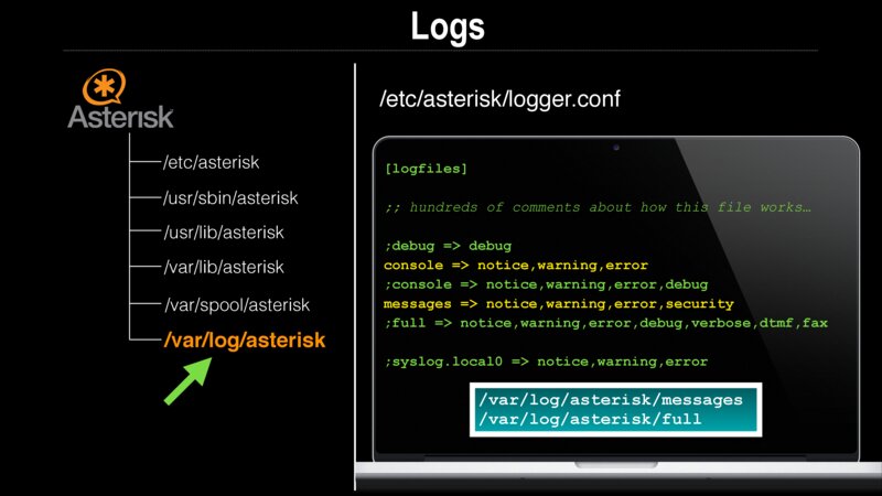 Logs /etc/asterisk/logger.conf /etc/asterisk /usr/sbin/asterisk /usr/lib/asterisk /var/lib/asterisk /var/spool/asterisk /var/log/asterisk [logfiles] ;; hundreds of comments about how this file works… ;debug => debug console => notice,warning,error ;console => notice,warning,error,debug messages => notice,warning,error,security ;full => notice,warning,error,debug,verbose,dtmf,fax ;syslog.local0 => notice,warning,error /var/log/asterisk/messages /var/log/asterisk/full
