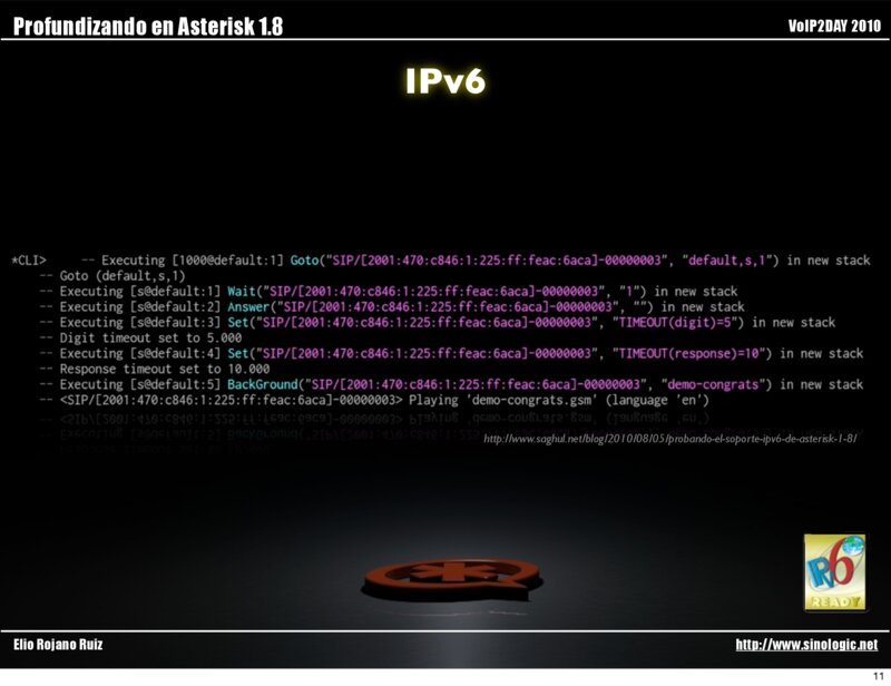 http://www.saghul.net/blog/2010/08/05/probando-el-soporte-ipv6-de-asterisk-1-8/ Elio Rojano Ruiz http://www.sinologic.net 10