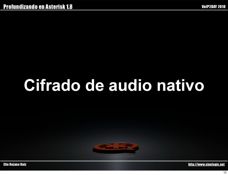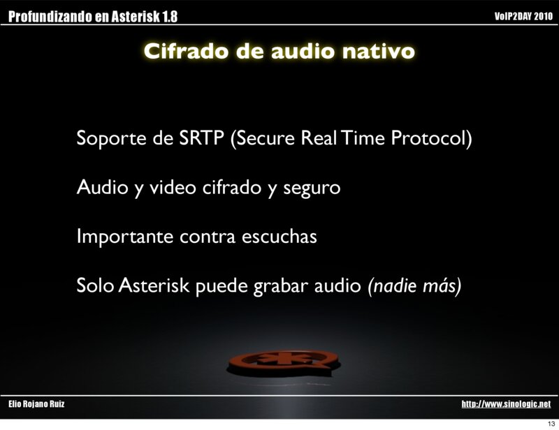 Profundizando en Asterisk 1.8 VoIP2DAY 2010 Cifrado de audio nativo Elio Rojano Ruiz http://www.sinologic.net 12