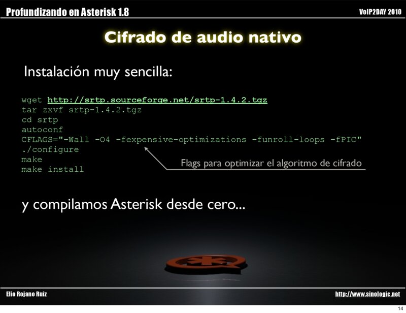 wget http://srtp.sourceforge.net/srtp-1.4.2.tgz tar zxvf srtp-1.4.2.tgz cd srtp autoconf CFLAGS="-Wall -O4 -fexpensive-optimizations -funroll-loops -fPIC" ./configure make Flags para optimizar el algoritmo de cifrado make install y compilamos Asterisk desde cero...