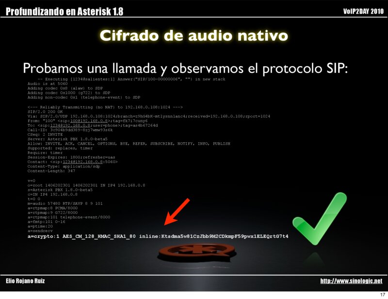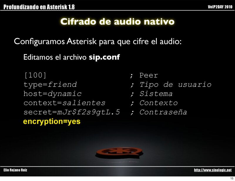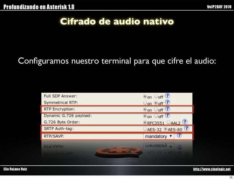 Profundizando en Asterisk 1.8 VoIP2DAY 2010 Cifrado de audio nativo Configuramos Asterisk para que cifre el audio: