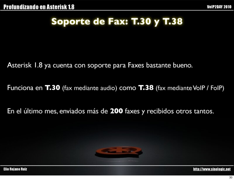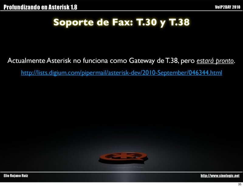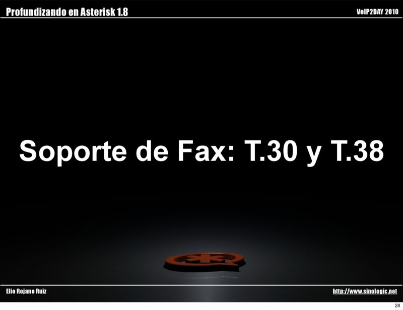 Profundizando en Asterisk 1.8 VoIP2DAY 2010 Soporte de Fax: T.30 y T.38 Actualmente Asterisk no funciona como Gateway de T.38, pero estará pronto.
