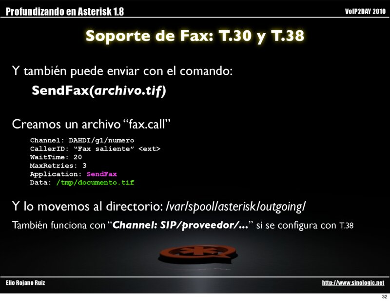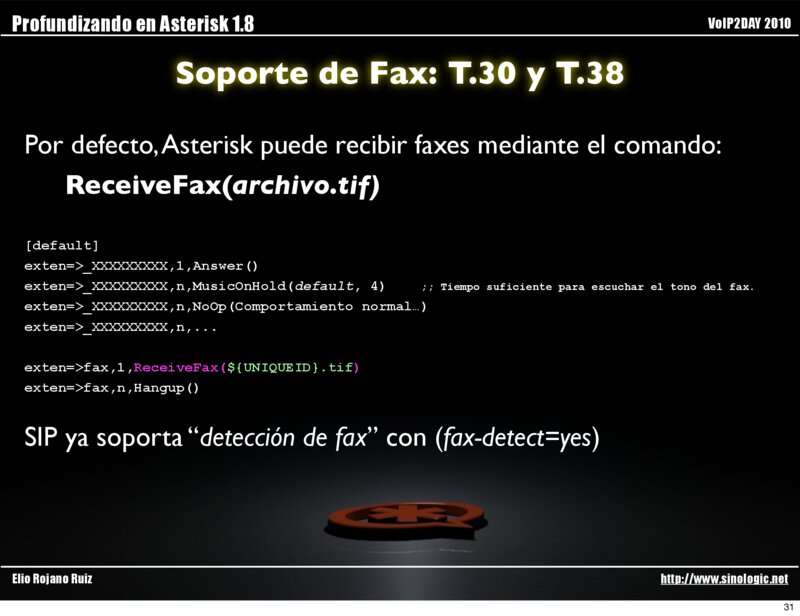 Profundizando en Asterisk 1.8 VoIP2DAY 2010 Soporte de Fax: T.30 y T.38 T.38 permite envío de faxes mediante redes IP.