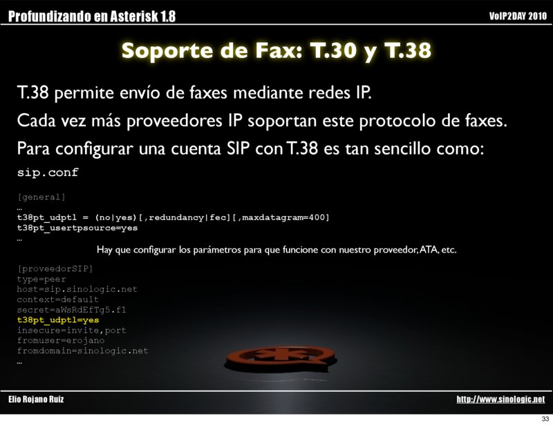 [proveedorSIP] type=peer host=sip.sinologic.net context=default secret=aWsRdEfTg5.f1 t38pt_udptl=yes insecure=invite,port fromuser=erojano fromdomain=sinologic.net … Elio Rojano Ruiz http://www.sinologic.net 33