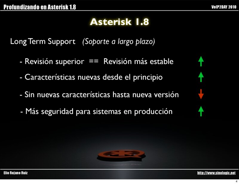 Profundizando en Asterisk 1.8 VoIP2DAY 2010 Asterisk 1.8 Asterisk 1.4 (LTS) Long Term Support Asterisk 1.6.x (Standard) Asterisk 1.8 (LTS) Long Term Support Elio Rojano Ruiz http://www.sinologic.net 3
