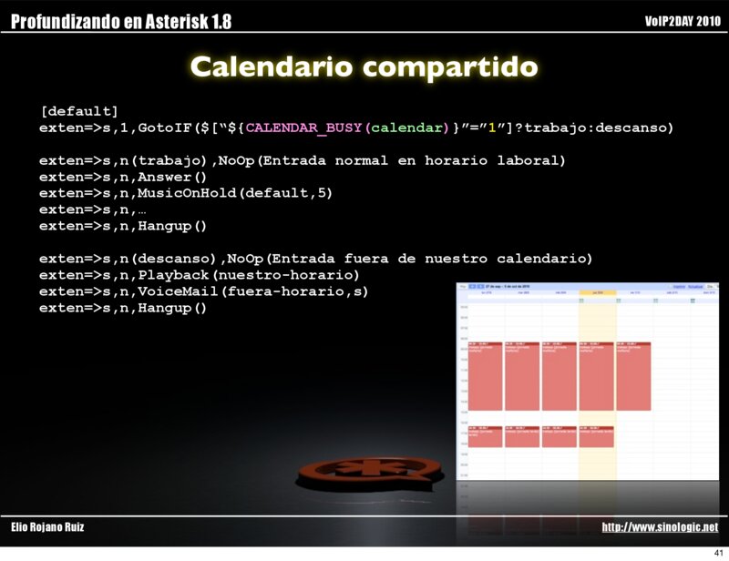 Profundizando en Asterisk 1.8 VoIP2DAY 2010 Calendario compartido calendar.conf [calendar] type = ical url = http://calendar.sinologic.net/erojano/asterisk/micalendario.ical user = erojano secret = supersecret refresh = 15 timeframe = 60 app = Playback appdata = tt-weasels waittime = 30 Elio Rojano Ruiz http://www.sinologic.net 40