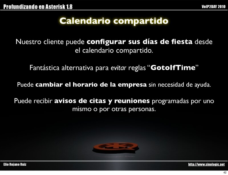 Profundizando en Asterisk 1.8 VoIP2DAY 2010 Calendario compartido [default] exten=>s,1,GotoIF($[“${CALENDAR_BUSY(calendar)}”=”1”]?trabajo:descanso) exten=>s,n(trabajo),NoOp(Entrada normal en horario laboral) exten=>s,n,Answer() exten=>s,n,MusicOnHold(default,5) exten=>s,n,… exten=>s,n,Hangup() exten=>s,n(descanso),NoOp(Entrada fuera de nuestro calendario) exten=>s,n,Playback(nuestro-horario) exten=>s,n,VoiceMail(fuera-horario,s) exten=>s,n,Hangup() Elio Rojano Ruiz http://www.sinologic.net 41