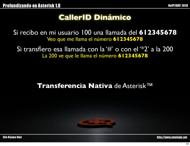 Profundizando en Asterisk 1.8 VoIP2DAY 2010 Caller-ID Dinámico Elio Rojano Ruiz http://www.sinologic.net 44
