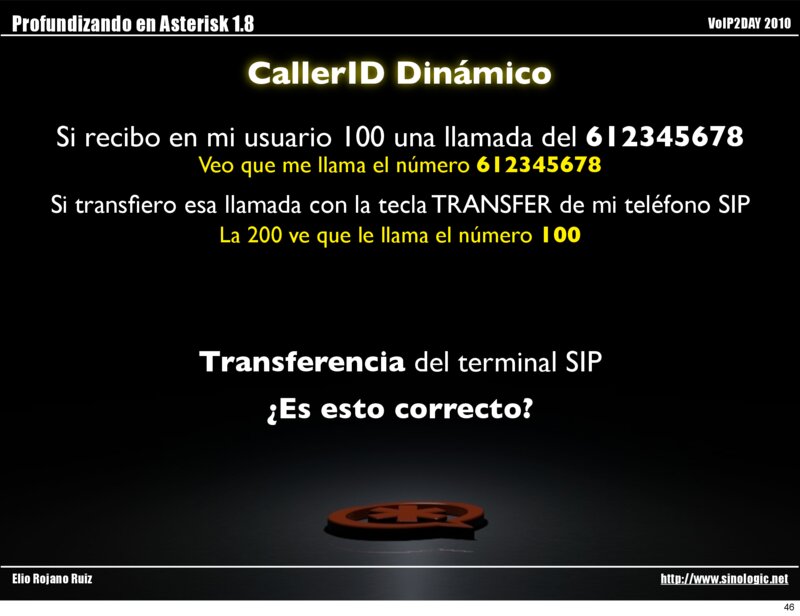 Profundizando en Asterisk 1.8 VoIP2DAY 2010 CallerID Dinámico Si recibo en mi usuario 100 una llamada del 612345678 Veo que me llama el número 612345678 Si transfiero esa llamada con la ‘#’ o con el ‘*2’ a la 200 La 200 ve que le llama el número 612345678 Transferencia Nativa de Asterisk™ Elio Rojano Ruiz http://www.sinologic.net 45