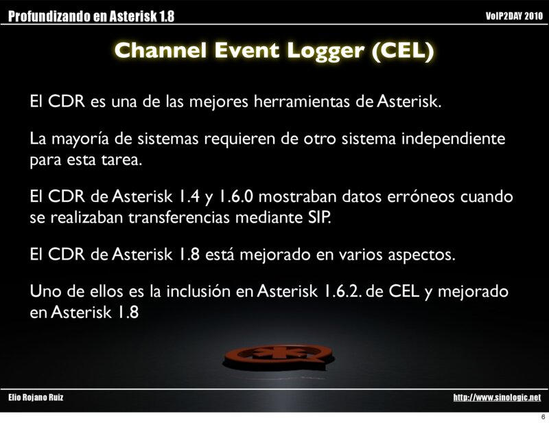 Profundizando en Asterisk 1.8 VoIP2DAY 2010 Channel Event Logger (CEL) Elio Rojano Ruiz http://www.sinologic.net 5