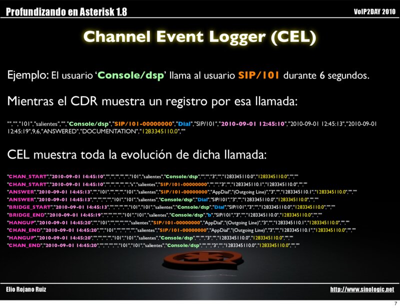 Uno de ellos es la inclusión en Asterisk 1.6.2. de CEL y mejorado en Asterisk 1.8 Elio Rojano Ruiz http://www.sinologic.net 6
