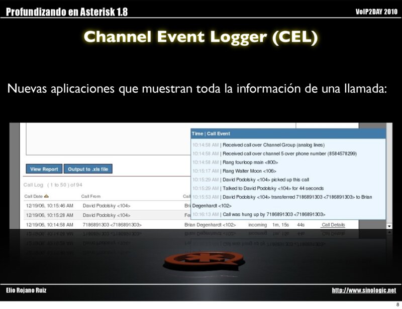 Profundizando en Asterisk 1.8 VoIP2DAY 2010 Channel Event Logger (CEL) Nuevas aplicaciones que muestran toda la información de una llamada: