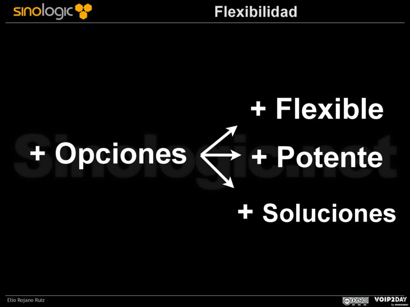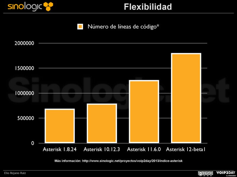 Flexibilidad Número de líneas de código* 2000000 Sinologic.net 1500000 1000000 500000 0 Asterisk 1.8.24 Asterisk 10.12.3 Asterisk 11.6.0 Asterisk 12-beta1 Más información: http://www.sinologic.net/proyectos/voip2day/2013/indice-asterisk Elio Rojano Ruiz