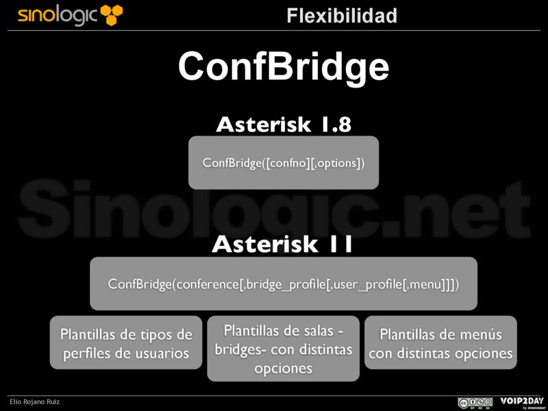 Flexibilidad ConfBridge Asterisk 1.8 Sinologic.net ConfBridge([confno][,options]) Asterisk 11 ConfBridge(conference[,bridge_profile[,user_profile[,menu]]]) Plantillas de tipos de perfiles de usuarios Elio Rojano Ruiz Plantillas de salas bridges- con distintas opciones Plantillas de menús con distintas opciones