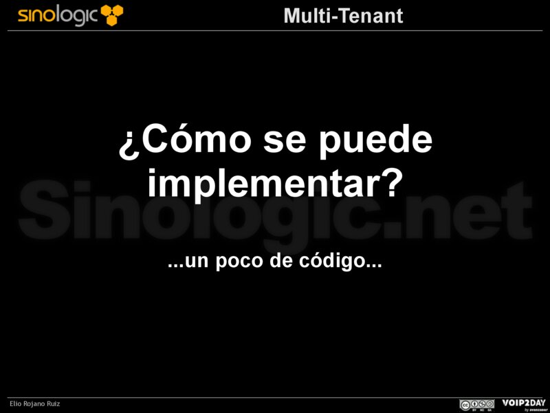 Multi-Tenant extensions.conf exten=>912345678,1,Goto(empresa1,s,1) exten=>987654321,1,Goto(empresaN,s,1) [empresa1] #include “extensions_empresa1.conf” Sinologic.net [empresaN] #include “extensions_empresaN.conf” exten => s,1,Set(CHANNEL(namedcallgroup)=empresa1) exten => s,n,Playback(empresa1_bienvenida) exten => s,n,Goto(empresa1_IVR,s,1) [empresa1_IVR] exten => s,1,Read(opcion,empresa1_menuyopciones) exten => s,n,Goto(empresa1_IVR,${opcion},1) exten => 1,1,Dial(SIP/empresa1_300) exten => 2,1,Dial(SIP/empresa1_301) exten => 3,1,Queue(empresa1_comercial) exten => 4,1,Queue(empresa1_soporte) [empresa1_outgoing] exten=>_3XX,1,Dial(SIP/empresa1_${EXTEN}) exten=>_[67]XXXXXXXX,1,Macro(llamadaExterna,”empresa1”) exten=>_[67]XXXXXXXX,1,Macro(llamadaExterna,”empresa1”) exten=>*89,1,Answer() exten=>*89,n,VoiceMailMain(empresa1_${CALLERID(name)}@empresa1) Elio Rojano Ruiz