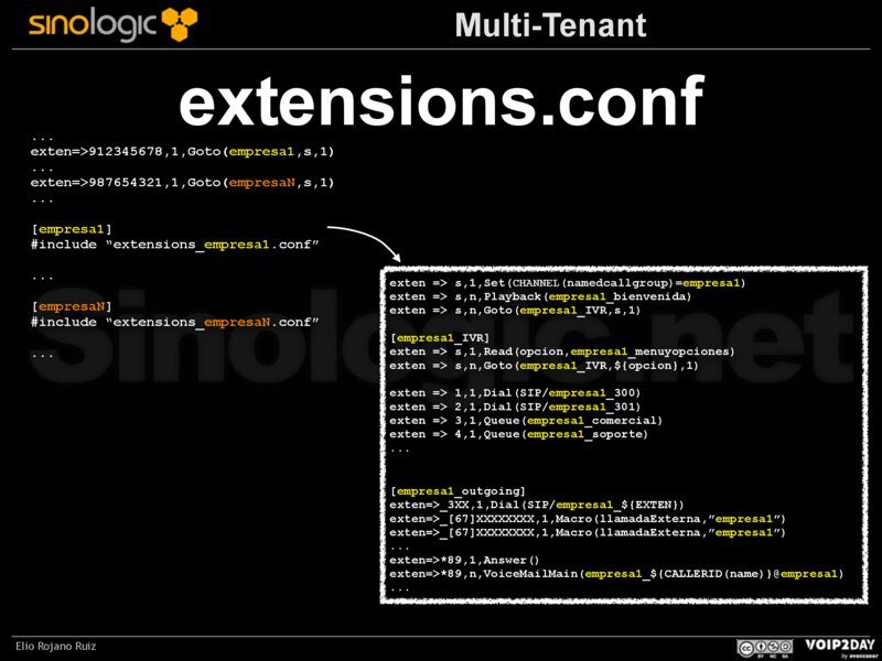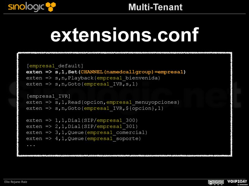 Multi-Tenant extensions.conf [empresa1_default] exten => s,1,Set(CHANNEL(namedcallgroup)=empresa1) exten => s,n,Playback(empresa1_bienvenida) exten => s,n,Goto(empresa1_IVR,s,1) Sinologic.net [empresa1_IVR] exten => s,1,Read(opcion,empresa1_menuyopciones) exten => s,n,Goto(empresa1_IVR,${opcion},1) exten => 1,1,Dial(SIP/empresa1_300) exten => 2,1,Dial(SIP/empresa1_301) exten => 3,1,Queue(empresa1_comercial) exten => 4,1,Queue(empresa1_soporte) Elio Rojano Ruiz