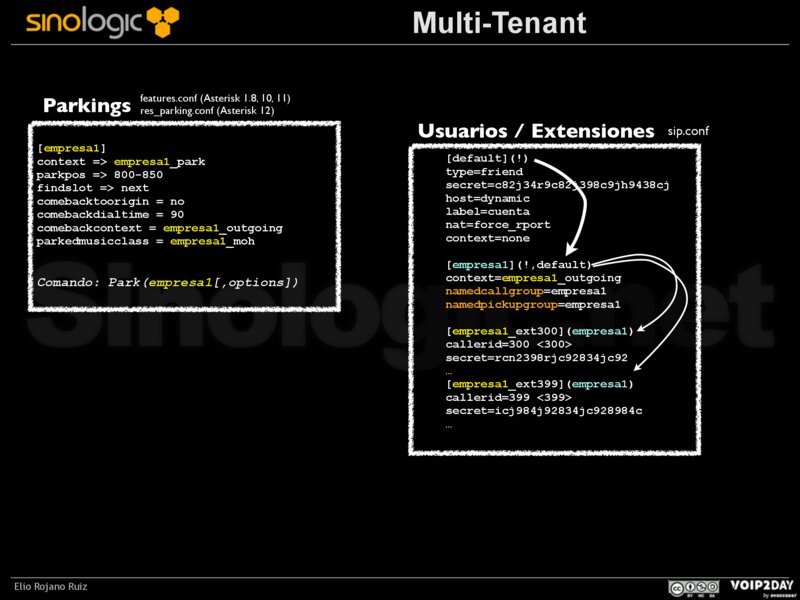 Multi-Tenant features.conf (Asterisk 1.8, 10, 11) Parkings res_parking.conf (Asterisk 12) [empresa1] context => empresa1_park parkpos => 800-850 findslot => next comebacktoorigin = no comebackdialtime = 90 comebackcontext = empresa1_outgoing parkedmusicclass = empresa1_moh Usuarios / Extensiones sip.conf [default](!) type=friend secret=c82j34r9c82j398c9jh9438cj host=dynamic label=cuenta nat=force_rport context=none Sinologic.net Comando: Park(empresa1[,options]) [empresa1](!,default) context=empresa1_outgoing namedcallgroup=empresa1 namedpickupgroup=empresa1 [empresa1_ext300](empresa1) callerid=300 <300> secret=rcn2398rjc92834jc92 … [empresa1_ext399](empresa1) callerid=399 <399> secret=icj984j92834jc928984c … Elio Rojano Ruiz