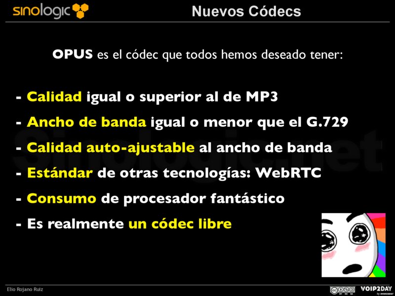 - Calidad igual o superior al de MP3 Sinologic.net - Ancho de banda igual o menor que el G.729 - Calidad auto-ajustable al ancho de banda - Estándar de otras tecnologías: WebRTC - Consumo de procesador fantástico - Es realmente un códec libre Elio Rojano Ruiz