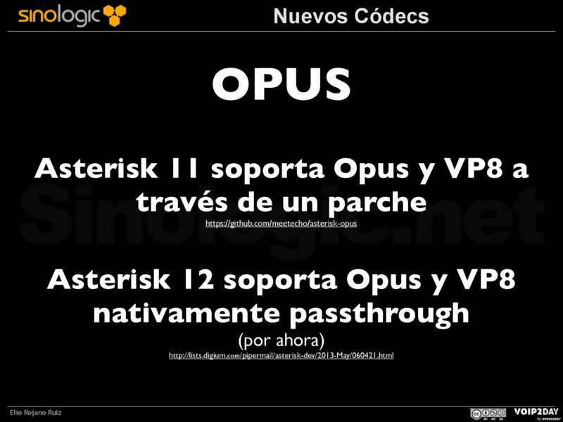 Asterisk 11 soporta Opus y VP8 a través de un parche Sinologic.net https://github.com/meetecho/asterisk-opus Asterisk 12 soporta Opus y VP8 nativamente passthrough (por ahora) http://lists.digium.com/pipermail/asterisk-dev/2013-May/060421.html Elio Rojano Ruiz