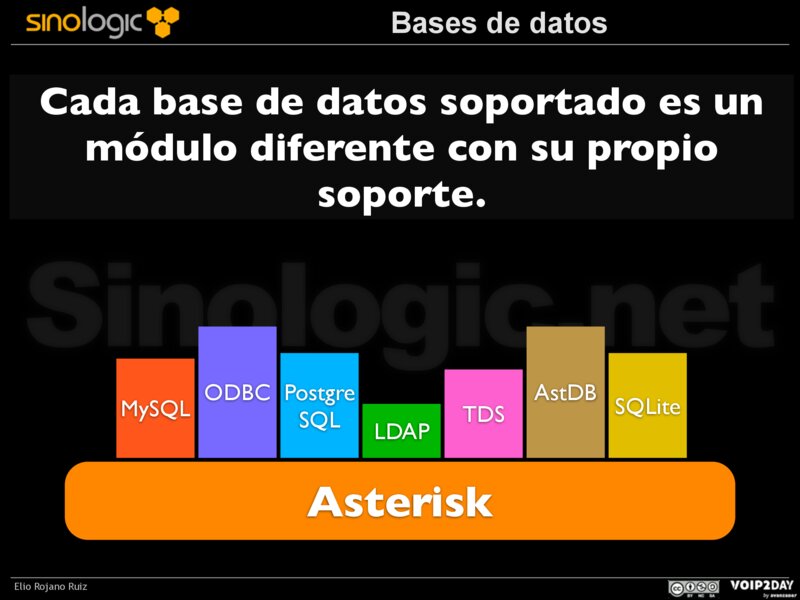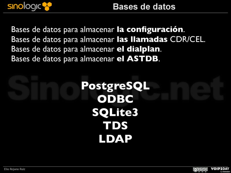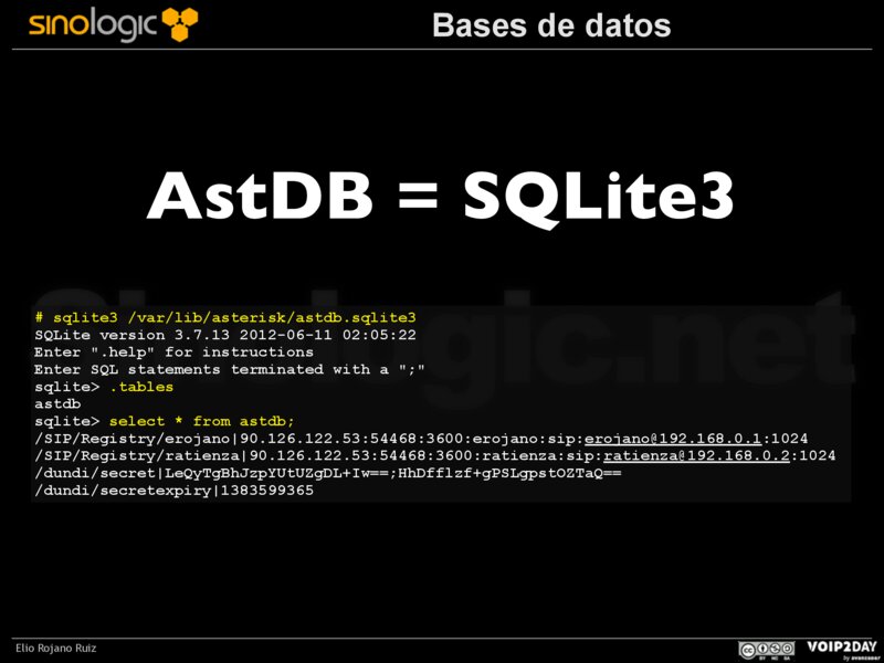 Bases de datos AstDB = SQLite3 Sinologic.net # sqlite3 /var/lib/asterisk/astdb.sqlite3 SQLite version 3.7.13 2012-06-11 02:05:22 Enter ".help" for instructions Enter SQL statements terminated with a ";" sqlite> .tables astdb sqlite> select * from astdb; /SIP/Registry/erojano|90.126.122.53:54468:3600:erojano:sip:erojano@192.168.0.1:1024 /SIP/Registry/ratienza|90.126.122.53:54468:3600:ratienza:sip:ratienza@192.168.0.2:1024 /dundi/secret|LeQyTgBhJzpYUtUZgDL+Iw==;HhDfflzf+gPSLgpstOZTaQ== /dundi/secretexpiry|1383599365 Elio Rojano Ruiz