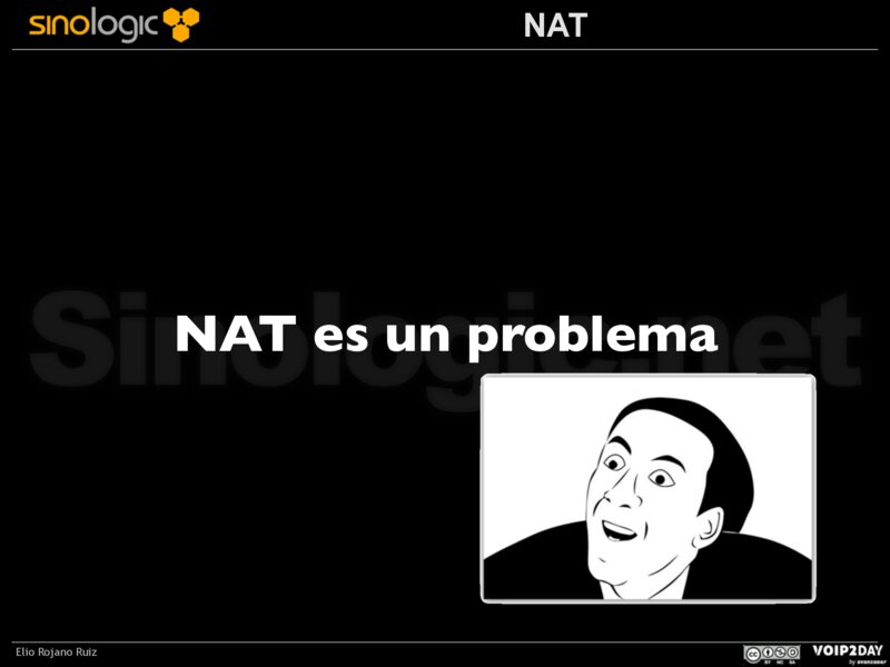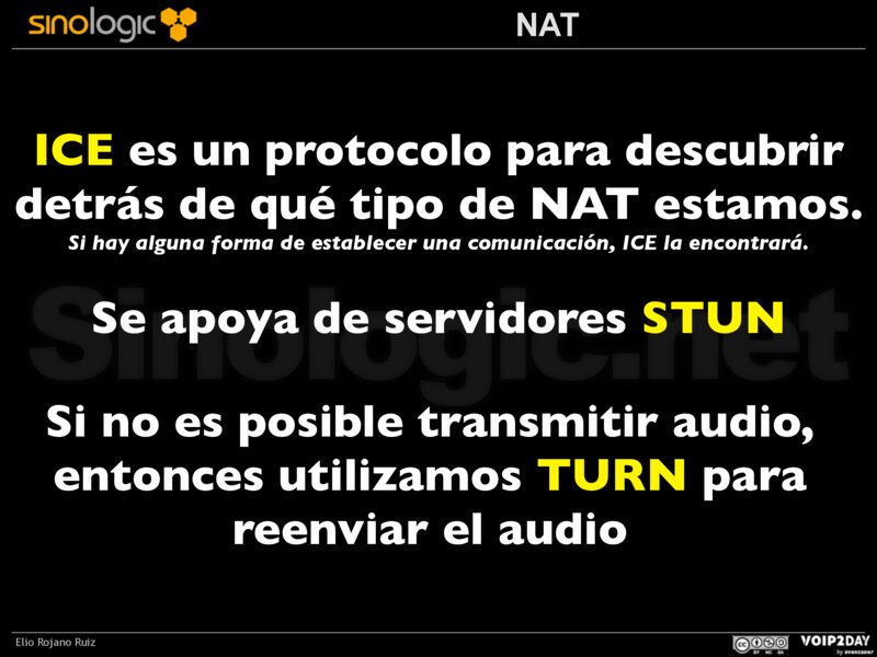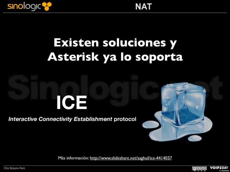 NAT Existen soluciones y Asterisk ya lo soporta Sinologic.net ICE Interactive Connectivity Establishment protocol Más información: http://www.slideshare.net/saghul/ice-4414037 Elio Rojano Ruiz