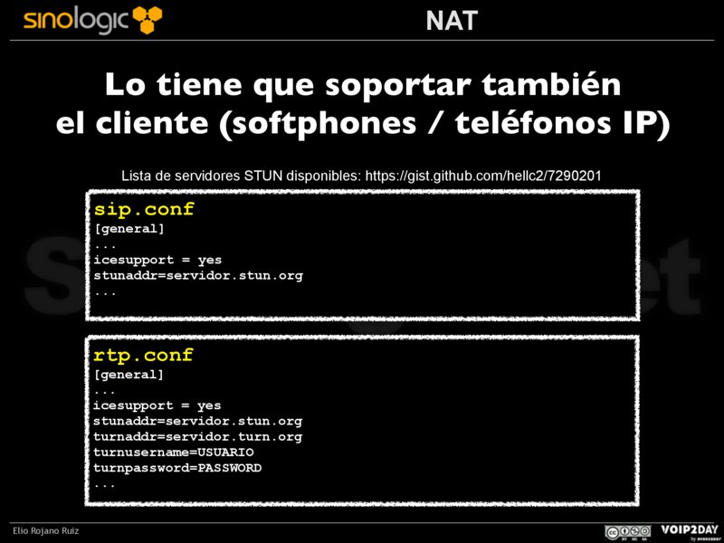 NAT Lo tiene que soportar también el cliente (softphones / teléfonos IP) Lista de servidores STUN disponibles: https://gist.github.com/hellc2/7290201 Sinologic.net sip.conf [general] icesupport = yes stunaddr=servidor.stun.org rtp.conf [general] icesupport = yes stunaddr=servidor.stun.org turnaddr=servidor.turn.org turnusername=USUARIO turnpassword=PASSWORD Elio Rojano Ruiz