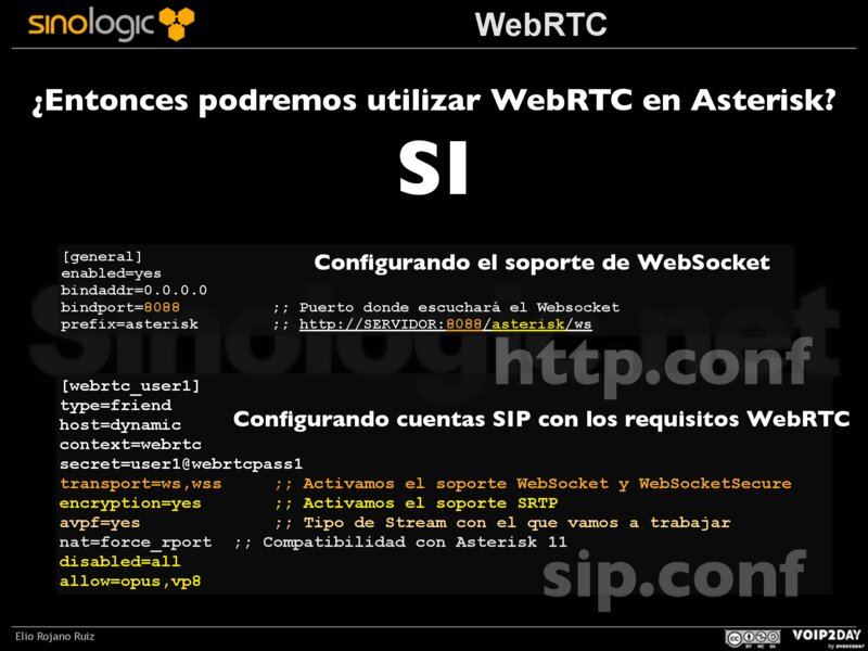 SI Sinologic.net http.conf [general] enabled=yes bindaddr=0.0.0.0 bindport=8088 prefix=asterisk Configurando el soporte de WebSocket ;; Puerto donde escuchará el Websocket ;; http://SERVIDOR:8088/asterisk/ws [webrtc_user1] type=friend Configurando cuentas SIP con los requisitos WebRTC host=dynamic context=webrtc secret=user1@webrtcpass1 transport=ws,wss ;; Activamos el soporte WebSocket y WebSocketSecure encryption=yes ;; Activamos el soporte SRTP avpf=yes ;; Tipo de Stream con el que vamos a trabajar nat=force_rport ;; Compatibilidad con Asterisk 11 disabled=all allow=opus,vp8 sip.conf Elio Rojano Ruiz