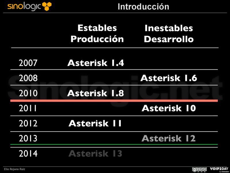 Introducción Estables Producción 2007 Inestables Desarrollo Asterisk 1.4 Sinologic.net Asterisk 1.6 2008 2010 Asterisk 1.8 Asterisk 10 2011 2012 Asterisk 11 Asterisk 12 2013 2014 Elio Rojano Ruiz Asterisk 13