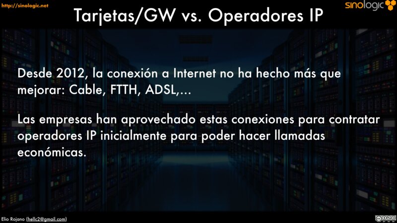 http://sinologic.net Tarjetas/GW vs. Operadores IP Desde 2012, la conexión a Internet no ha hecho más que mejorar: Cable, FTTH, ADSL,… Las empresas han aprovechado estas conexiones para contratar operadores IP inicialmente para poder hacer llamadas económicas.