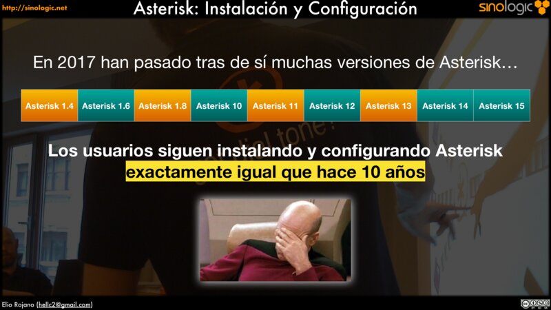 http://sinologic.net Asterisk: Instalación y Configuración En 2017 han pasado tras de sí muchas versiones de Asterisk… Asterisk 1.4 Asterisk 1.6 Asterisk 1.8 Asterisk 10 Asterisk 11 Asterisk 12 Asterisk 13 Asterisk 14 Asterisk 15 Los usuarios siguen instalando y configurando Asterisk exactamente igual que hace 10 años Elio Rojano (hellc2@gmail.com)