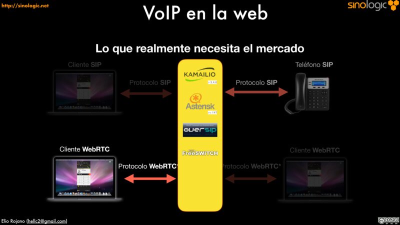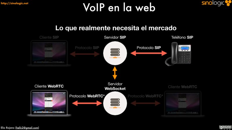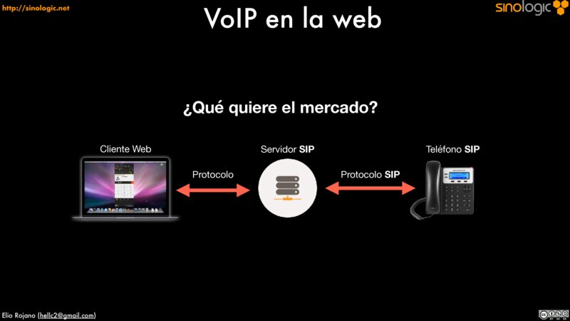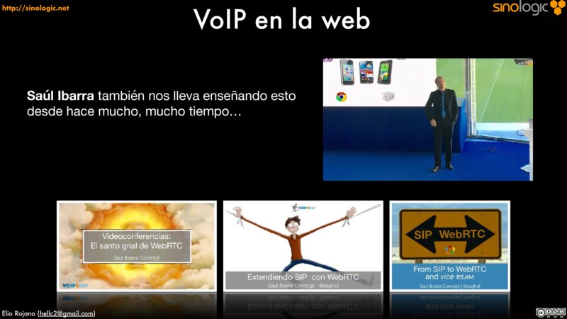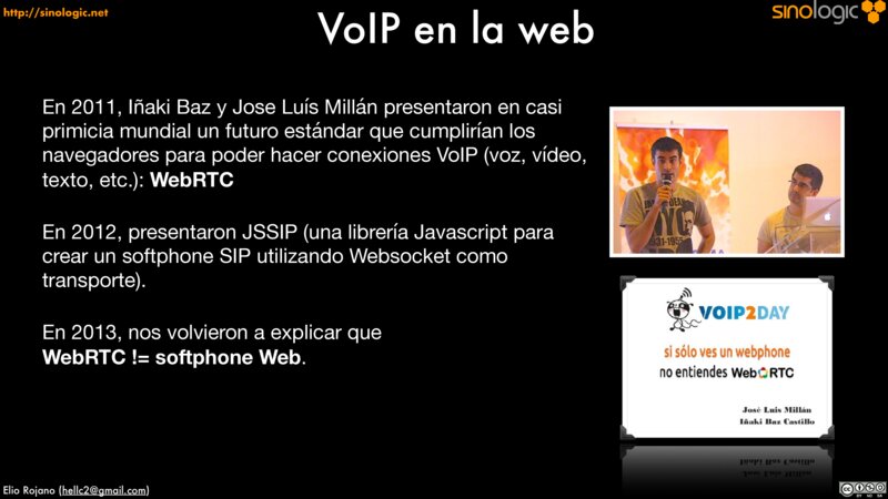 http://sinologic.net VoIP en la web En 2011, Iñaki Baz y Jose Luís Millán presentaron en casi primicia mundial un futuro estándar que cumplirían los navegadores para poder hacer conexiones VoIP (voz, vídeo, texto, etc.): WebRTC En 2012, presentaron JSSIP (una librería Javascript para crear un softphone SIP utilizando Websocket como transporte).