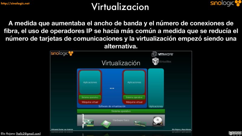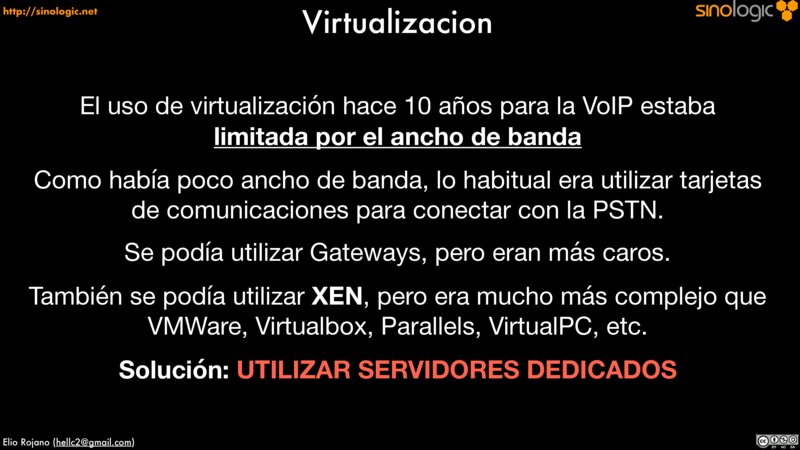 Virtualizacion http://sinologic.net El uso de virtualización hace 10 años para la VoIP estaba limitada por el ancho de banda Como había poco ancho de banda, lo habitual era utilizar tarjetas de comunicaciones para conectar con la PSTN.