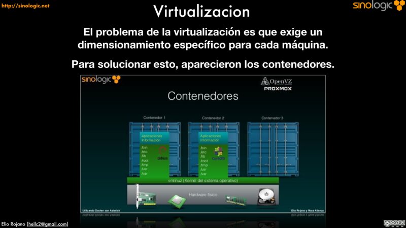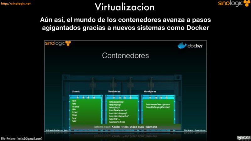 Virtualizacion http://sinologic.net Aún así, el mundo de los contenedores avanza a pasos agigantados gracias a nuevos sistemas como Docker Elio Rojano (hellc2@gmail.com)