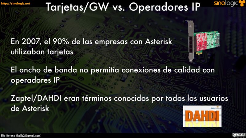 http://sinologic.net Tarjetas/GW vs. Operadores IP En 2007, el 90% de las empresas con Asterisk utilizaban tarjetas El ancho de banda no permitía conexiones de calidad con operadores IP Zaptel/DAHDI eran términos conocidos por todos los usuarios de Asterisk Elio Rojano (hellc2@gmail.com)