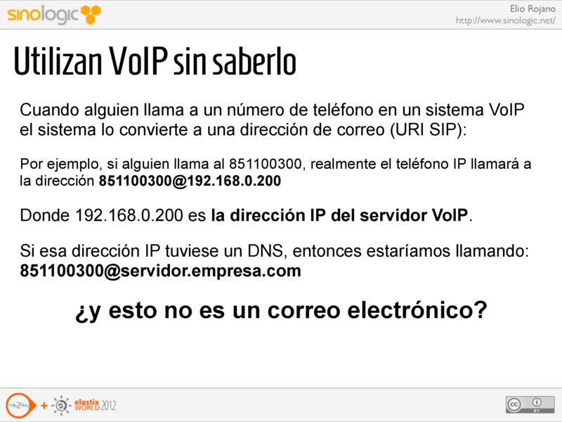 Elio Rojano http://www.sinologic.net/ Utilizan VoIP sin saberlo Cuando alguien llama a un número de teléfono en un sistema VoIP el sistema lo convierte a una dirección de correo (URI SIP):
