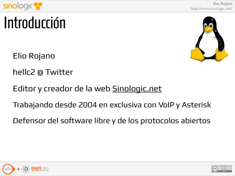 Elio Rojano http://www.sinologic.net/ Introducción Elio Rojano hellc2 @ Twitter Editor y creador de la web Sinologic.net Trabajando desde 2004 en exclusiva con VoIP y Asterisk Defensor del so!ware libre y de los protocolos abiertos