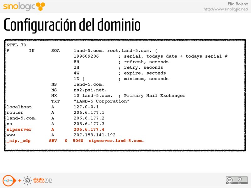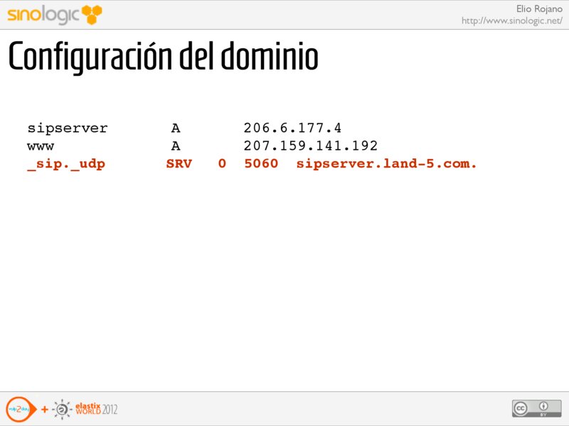 Elio Rojano http://www.sinologic.net/ Configuración del dominio sipserver www _sip._udp A A SRV 0 206.6.177.4 207.159.141.192 5060 sipserver.land-5.com.